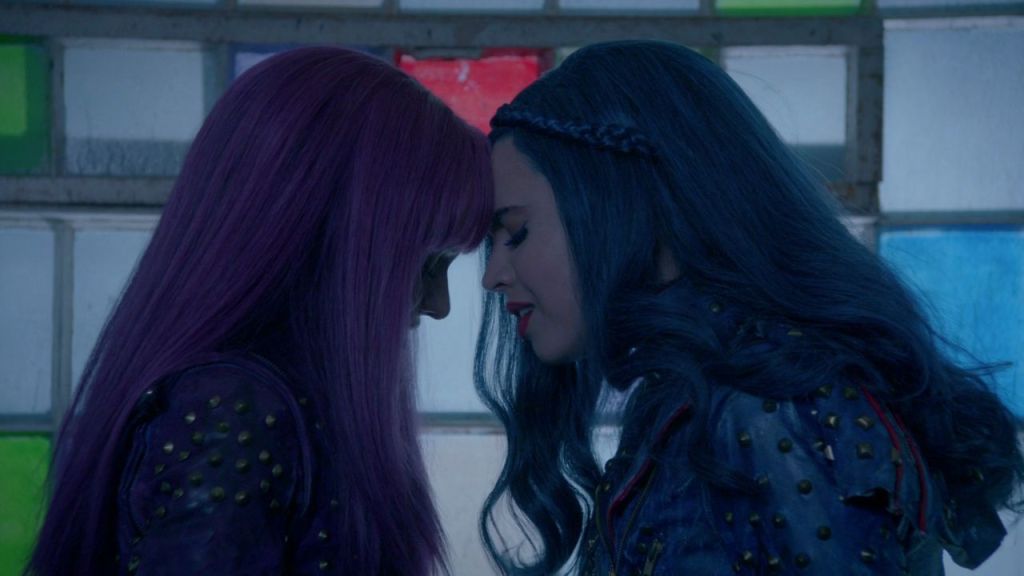 Lyrics such as “You’ll never be alone // No matter where you go” and “Even if we’re worlds apart // You’re still in my heart // It will always be you and me” would be widely read as romantic if they were sung by a man and a woman. As a result, sapphic fans don’t have to make gigantic mental leaps to see Mal and Evie as something other than straight. The subversive nature of Descendants in general basically encourages such a reading.