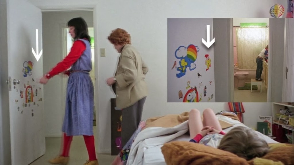 Other commentators in the documentary pick up on a number of continuity errors in the film. These errors originally came from Kubrick stitching together multiple takes to make a complete scene, but become, in the eyes of some, proof of a deeper conspiracy. Cocks highlights a scene where a sticker on Danny’s door depicting Dopey the dwarf disappears mid-scene, using it as proof that he is now enlightened to the horrors of the world. “Now he knows, he is no longer a dope about things,” Cocks says.