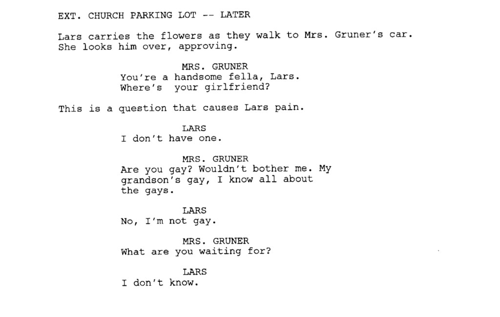 The brilliant thing about the whole screenplay, and what is made apparent in these fifteen pages, is the tone of the story. Looking at the world through Lars’ eyes means we completely understand mentally what is going on. We empathize with Lars as a fleshed out character who has human struggles. If the screenplay was written from the perspective of a different character we would view Lars as a strange man with some sort of mental illness, much like Gus initially does. Oliver continues the sincerity towards Lars by having the characters play along with his delusion of having a real relationship with Bianca the sex doll. Any conflict between Lars and another character isn’t because of Bianca but because of Lars and his shifting personality. The townsfolk love Lars for who he is and know Lars can do better when he sometimes acts irrational. Oliver’s screenplay never plays Lars’ mental health for cheap laughs and turns his situation into a positive catalyst for the town who all go along with the situation and actually see Bianca as a real person.