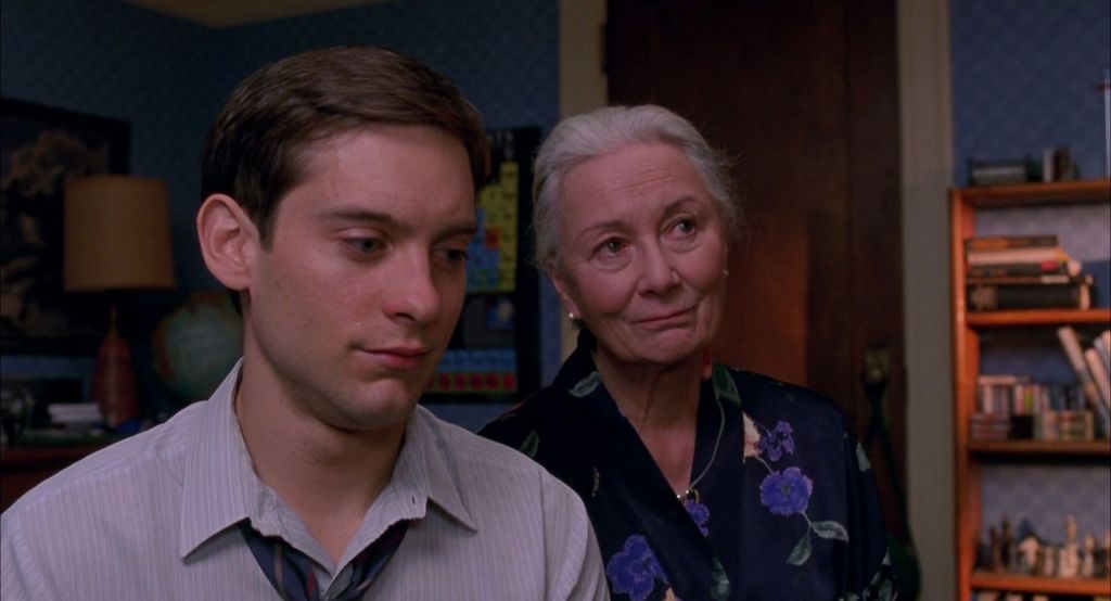 That line, combined with Peter’s guilt about his last interaction with his Uncle and not stopping the robber, acts as a precipice in Spider-Man’s origin story. Between trying to figure out what to do with his newfound abilities and finishing school, Peter has very little time to actually process the shock of his Uncle’s sudden death. He finds himself in a position where he has to grow up quickly, attempting to stay strong for his Aunt May (Rosemary Harris) and maintain some sense of normality. Peter’s motivations as Spider-Man become more realized, allowing him a platform to seek justice and prevent others from harm or experiencing losses of their own. Taking on a role as a “vigilante crime fighter” is his act of grieving. In acknowledging the responsibility he has with his powers and the kind of man he could become by doing good, Peter is simultaneously honoring his Uncle and finding purpose in all that he’s capable of.
