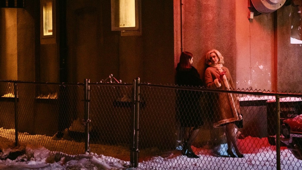 Similarly to the plot, the relationship between the two women is unpredictable and undefined. Eileen leaves many unanswered questions, including the nature of the dynamic between Eileen and Rebecca. Eileen appears instantly drawn to her new co-worker, craving her approval and showing a deep fascination into the life of this glamorous older woman. The film suggests a romantic connection between the two, though never fully explores the nature of their relationship. In a scene evoking the switching of names in the 2007 novel and 2017 film Call Me By Your Name, Rebecca tells a group of men in a bar that her name is Eileen, and introduces Eileen by her own name. Rebecca subsequently invites Eileen onto the dance floor, and the two engage in a visual display of their developing intimacy. Rebecca spurns male attention, even becoming violent towards a man trying to interrupt their dancing. When Rebecca then invites Eileen over for Christmas, it appears as though this is a defining moment for their relationship, and Eileen’s excitement at the prospect is evident. However, what the film cleverly conveys is how both Eileen’s and the audience’s expectations are quickly shattered by what Rebecca has to reveal. Just as Eileen begins to question her relationship with Rebecca and how much she truly knows her, so is the audience questioning her motivations and how much either character can truly be trusted.